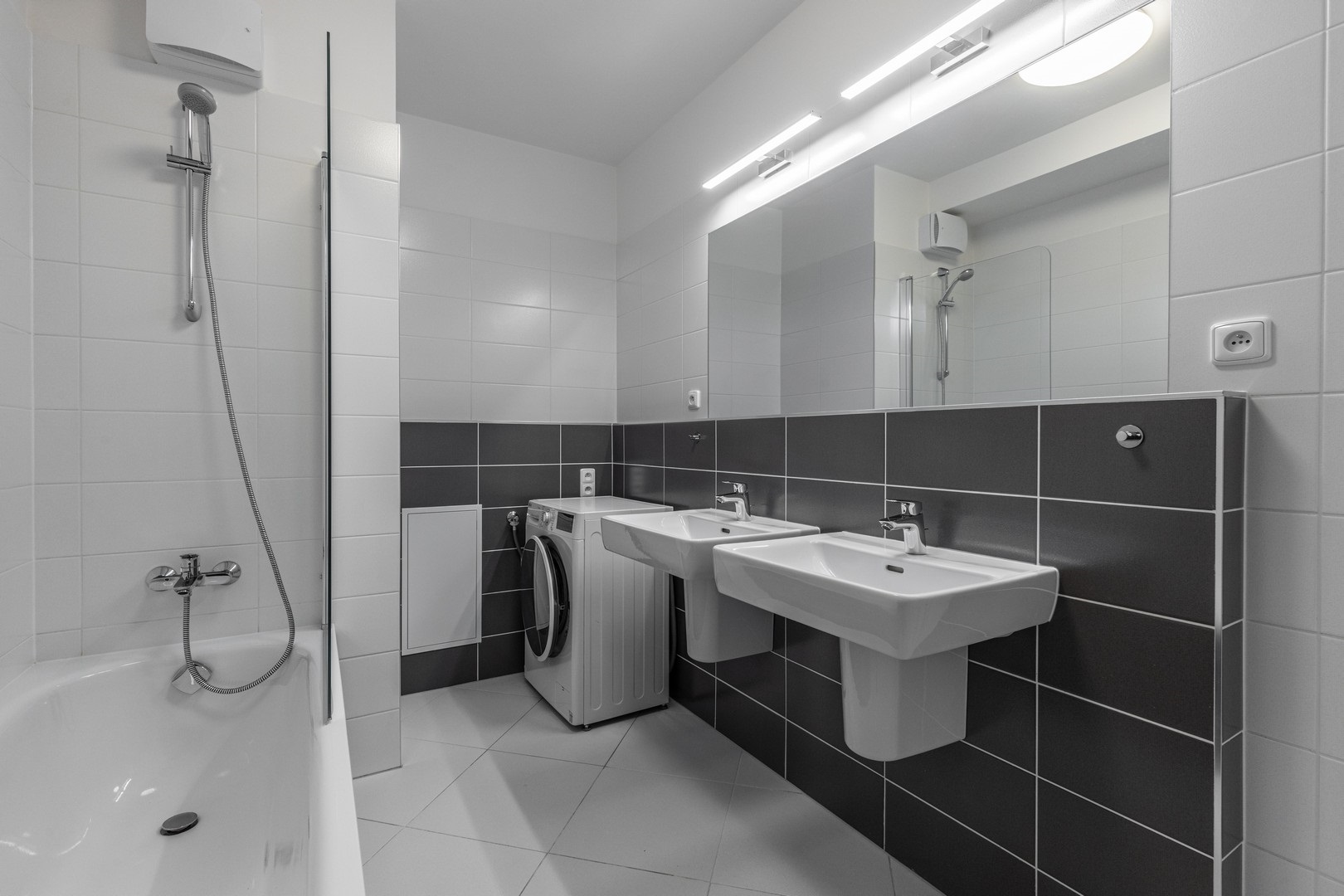 Byt je vybaven kuchyňskou linkou se spotřebiči (indukční varná deska, elektrická trouba, mikrovlná trouba, digestoř, led podsvícení, lednice zn. Samsung), v koupelně vana a pračka se sušičkou, WC je samostatně.